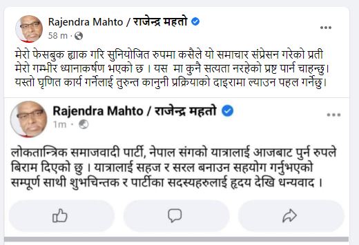 फेसबुक ह्याक भएपछि महतोले यसमा कुनै सत्यता नरहेको प्रष्ट पारेका छन् । उनले फेसबुकमा लेखेका छन्, ‘मेरो फेसबुक ह्याक गरि सुनियोजित रुपमा कसैले यो समाचार सम्प्रेषण गरेकोप्रति मेरो गम्भीर ध्यानाकर्षण भएको छ । यसमा कुनै सत्यता नरहेको प्रष्ट पार्न चाहन्छु । यस्तो घृणित कार्य गर्नेलाई तुरुन्त कानुनी दायरामा ल्याउन पहल गर्नेछु ।’