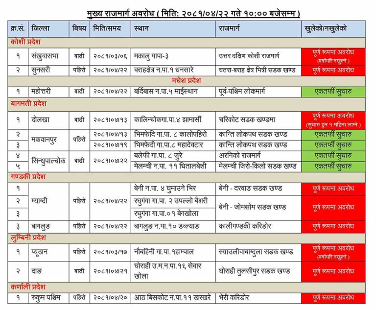 लुम्बिनी प्रदेश प्युठानमा पहिरो जाँदा असार १७ गतेदेखि स्याउलीवाबाग्दुला सडकखण्ड अवरुद्ध बनेको हो । उक्त सडक पनि बर्खाभरि नखुल्ने भएको छ । दाङको घोराही तुल्सीपुर सडकखण्डमा पर्ने सेवारखोलामा बाढीले क्ष्ति पुर्याउँदा सडक पूर्ण रुपमा अवरुद्ध भएको छ । घोराही उपमहानगरपालिका–१६ मा पर्ने उक्त खोलाले सडकमा सोमबार क्षति पुर्याएको थियो ।