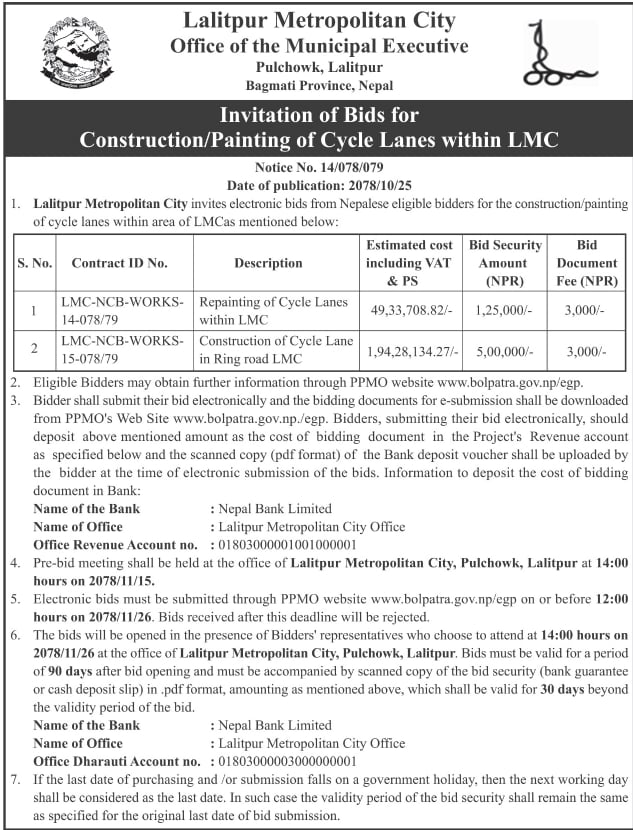 यस्तै, सोही टेण्डर सूचनामा महानगरपालिकामा यसअघि नै भएका साइकल लेनमा पुनः रंग लगाउन पनि टेण्डर आह्वन गरिएको छ ।