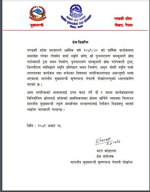 उनका प्रेस संयोजक भरत कोइरालाले जारी गरेको विज्ञप्तीअनुसार आफन्तका नाममा खोलिएका संघ संस्थाहरुका लागि विनियोजित रकम प्रदेशको प्राथमिकताका क्षेत्रमा खर्चिने व्यवस्था मिलाउन निर्देशन दिएको बताइएको छ ।