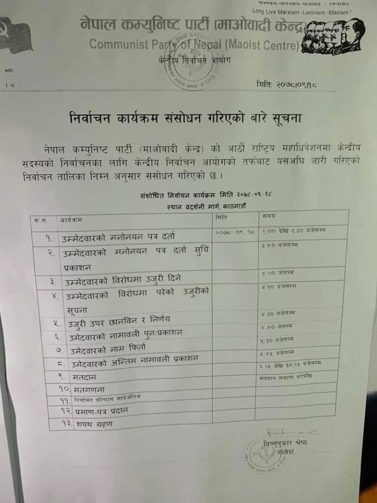 काठमाडौँ । नेकपा माओवादी केन्द्रको निर्वाचन आयोगले संशोधित निर्वाचन कार्यतालिका सार्वजनिक गरेको छ । उम्मेदवारको मनोनयनलगायत कार्यक्रम सार्वजनिक गरेको आयोगले बन्दसत्रको प्रस्तावअनुसार शनिबारका सबै कार्यक्रम स्थगन गरेको थियो ।