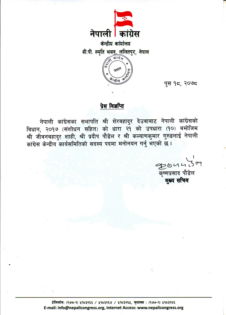 सभापति देउवाले नेपाली कांग्रेसको विधान, २०१७ (संशोधन सहित) को धारा २१ को उपधारा (१०) बमोजिम केन्द्रीय सदस्य मनोनयन गरेको मुख्य सचिव कृष्णप्रसाद पौडेलद्वारा जारी विज्ञप्तीमा उल्लेख छ ।