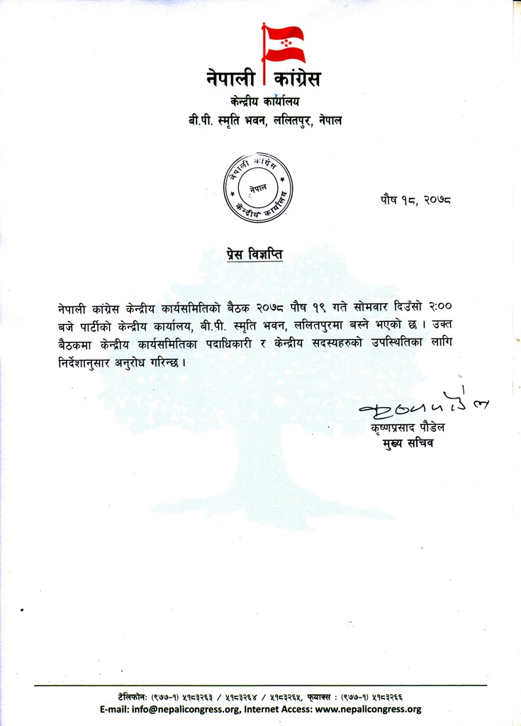 बैठक पार्टी केन्द्रीय कार्यालय, बी.पी. स्मृति भवन, ललितपुरमा बस्ने पार्टीका मुख्य सचिव कृष्णप्रसाद पौडेलले बताए । उक्त बैठकमा केन्द्रीय कार्यसमितिका पदाधिकारी र केन्द्रीय सदस्यहरु लाई निमन्त्रणा गरिएको छ ।