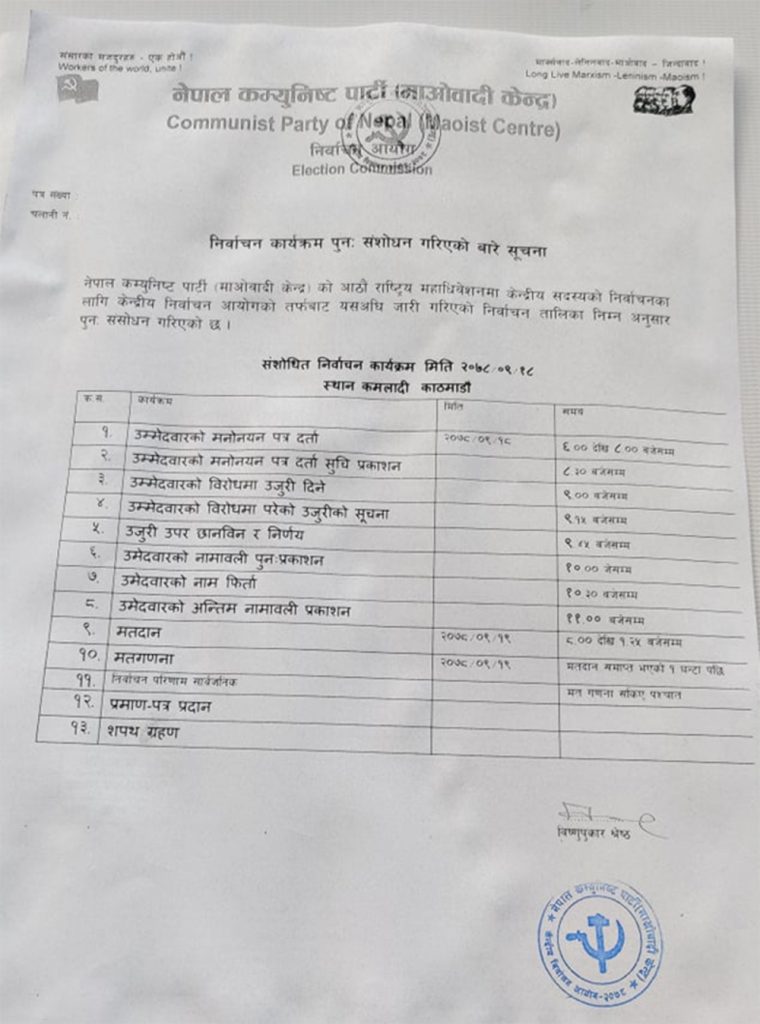 माओवादीले शनिबार राति ८ बजेदेखि तय गरिएको निर्वाचन कार्यतालिकालाई आइतवार दिउँसो २ बजेसम्मका लागि संशोधन गरेर सारेको थियो । त्यसपछि निर्वाचन कार्यतालिकालाई पुनः २ घण्टा पर सारेर दिउँसो ४ बजेका लागि सारिएकोमा अहिले केन्द्रीय समिति चयनका लागि उम्मेदवारी दर्ता बेलुकी ६ देखि राति ८ बजेसम्मका लागि तोकिएको छ ।
