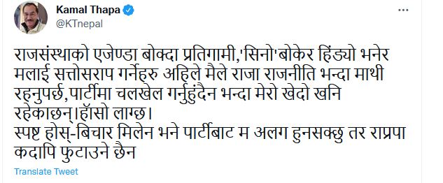 काठमाण्डौं । राप्रपा महाधिवेशनमा अध्यक्ष पदमा पराजित कमल थापाले पार्टी कुनै हालतमा नफुटाउने वताएका छन । महाधिवेशनमा पराजित भएपछि राजालाइ पार्टीमा हस्तक्षेप गरेर वारम्वार वताएर अव राजा नवोक्ने वताएका थापाले आफु पक्षधर वोकेर पार्टी तोडने हुन कि भन्ने आशंका वढिरहेको बेलामा उनले पार्टी नफुटाउने वताएका हुन । उनले यो उदघोष सामाजिक सञ्जालमा नै गरेका छन ।