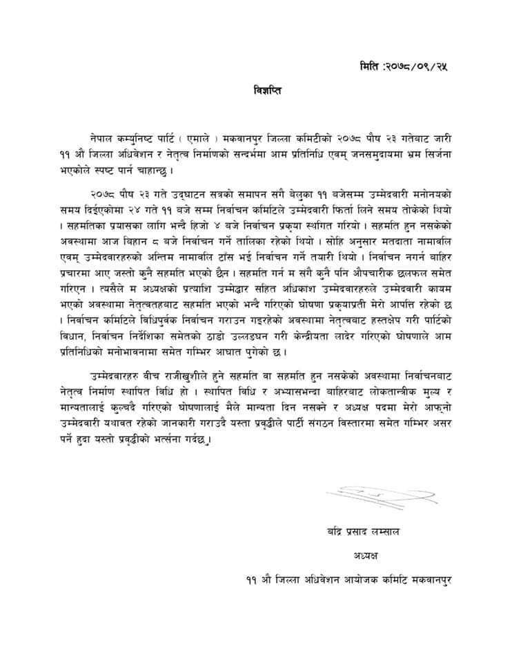 मकवानपुरको जिल्ला अधिवेशनमा अध्यक्षका प्रत्याशी वद्रीप्रसाद लम्सालले सोमवार विहानै वक्तब्य जारी गर्दै कुनै सहमति नभएको र आफु अध्यक्षको चुनाव कायम रहेको वताएकछन । उनले चुनावको तालिका सार्वजनिक गरेर अचानक सहमति भयो भन्दै अमुक ब्यक्तिलाइ टिका माला लगाउने काम ठिक भएन भनेर आपत्ति जनाएका छन ।