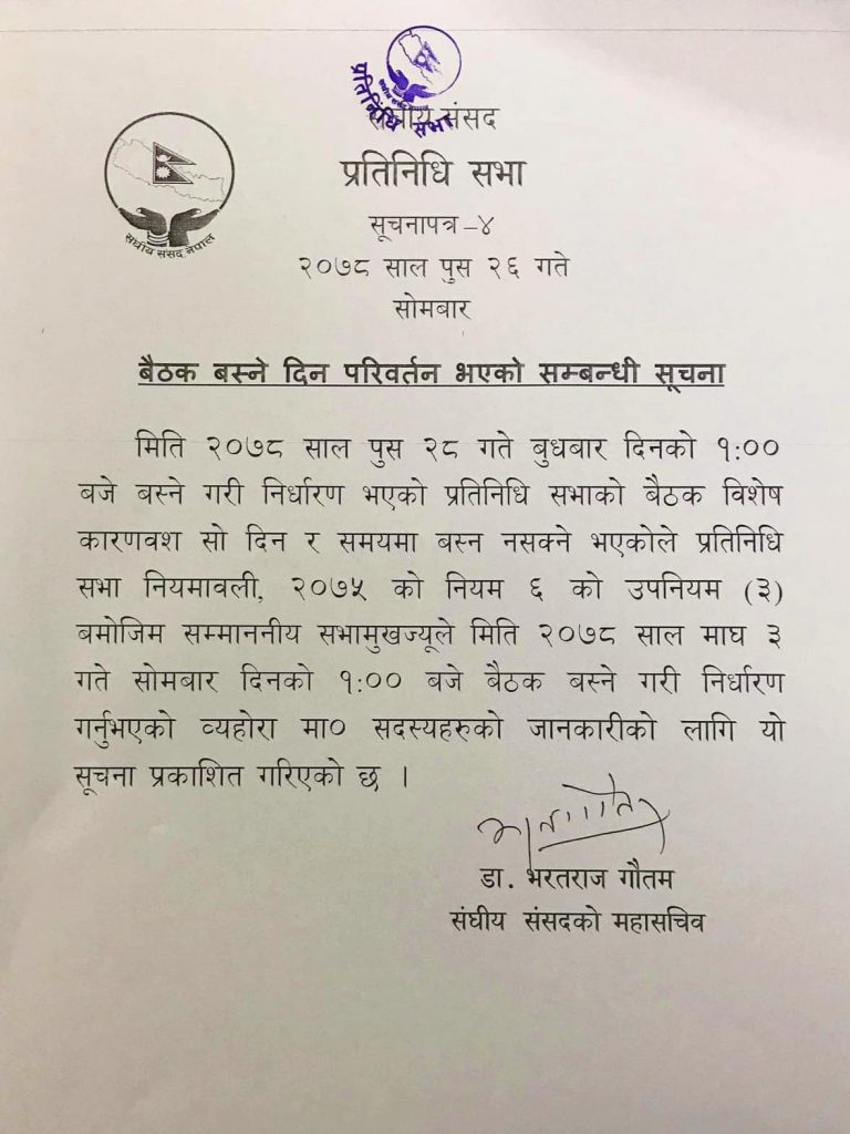 ‘मिति २०७८ साल पुस २८ गते बुधबार दिनको १ः०० बजे बस्ने गरी निर्धारण भएको प्रतिनिधि सभाको बैठक विशेष कारणवश सो दिन र समयमा बस्न नसक्ने भएकोले प्रतिनिधि सभा नियमावली, २०७५ को नियम ६ को उपनियम (३) बमोजिम सम्माननीय सभामुखज्यूले मिति २०७८ साल माघ ३ गते सोमबार दिनको १ः०० बजे बैठक बस्ने गरी निर्धारण गर्नुभएको व्यहोरा मा. सदस्यहरुको जानकारीको लागि यो सूचना प्रकाशित गरिएको छ,’ सचिवालयका महासचिव डा. भरतराज गौतमले जारी गरेको सूचनामा उल्लेख छ ।