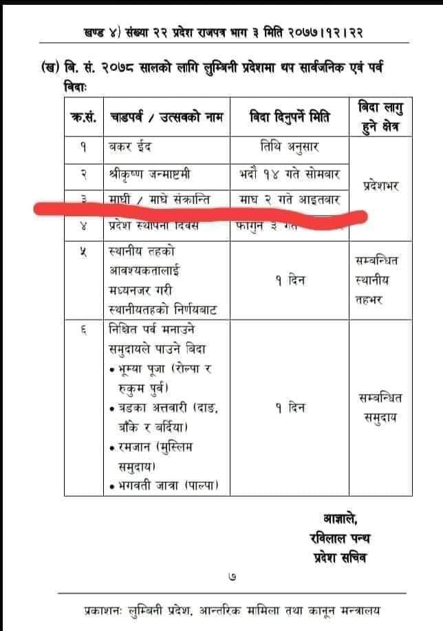 प्रदेश राजपत्रमा माघ २ गते सार्वजनिक विदा भन्दै माघे संक्रान्ति भनेर उल्लेख गरिएको छ । यो सुचना सार्वजनिक भएपछि यसको वारेमा खिसिटयुरी हुन थालेको छ ।