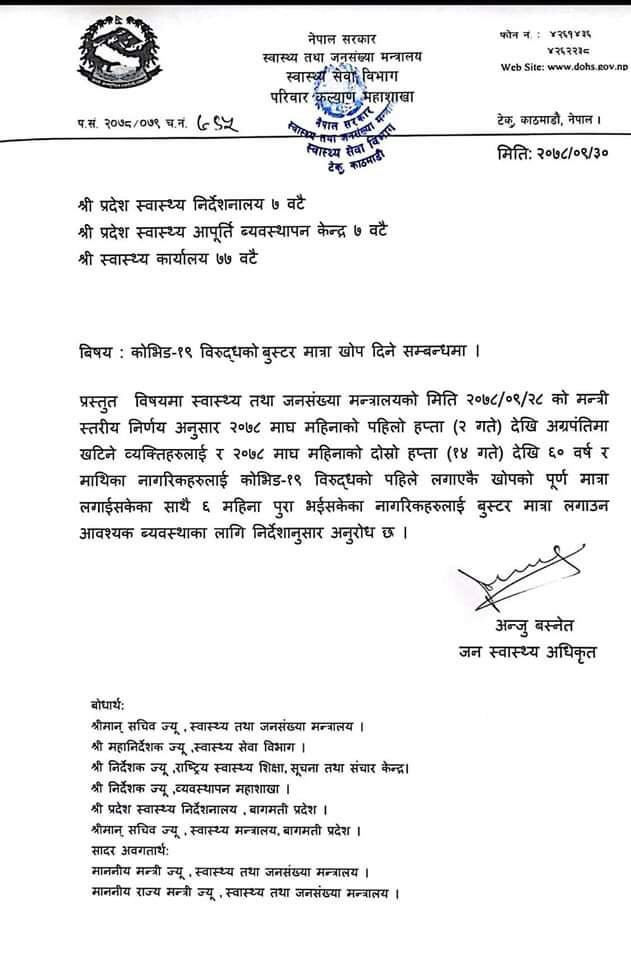 स्वास्थ्य सेवा विभागकी जनस्वास्थ्य अधिकृत अन्जु बस्नेतका अनुसार अग्रपंक्तिमा खटिने र ६० वर्षदेखि माथिका नागरिकहरुलाई बुस्टर डोज दिन लागिएको हो। त्यसका लागि माघ २ र १४ गते तोकिएको छ ।
