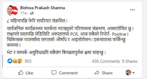 सार्वजनिक कार्यक्रममा सतर्कता नगरेकै कारण आफू संक्रमित भएको भन्दै उनले आत्मालोचना गरेका छन् । कोरोना लक्षणले ग्रस्तपछि नख्खुस्थित मेडिसिटी अस्पतालमा पीसीआर परीक्षण गर्दा परिवारका सबैको पोजेटिभ रिपोर्ट आएको शर्माले बताए ।