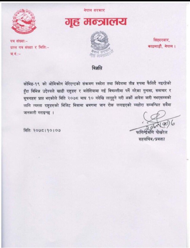 काठमाण्डौं । सरकारले भोलि सोमवार देखि लागु हुने गरि भिजिट भिसामा विदेश जान नेपालीलाइ रोक लगाएको छ । गृहमन्त्रालयले जारी गरेको नया सुचना अनुसार,भोलि देखि खाडी र मलेसियामा जान रोक लगाइएको छ । कोभिड संक्रमण तिव्र भएको र भिजिट भिसामा विदेश गएका नेपाली कोभिडले गर्दा विचल्ली परेको गुनासो आउन थालेपछि सरकारले तत्काल भिजिट भिसामा विदेश जान रोक लगाएको जनाएको छ । गृहमन्त्रालयका सहसचिव फणिन्द्रमणि पोखरेलले हस्ताक्षर गरेर जारी गरेको सुचनामा यस्तो जानकारी दिइएको हो ।
