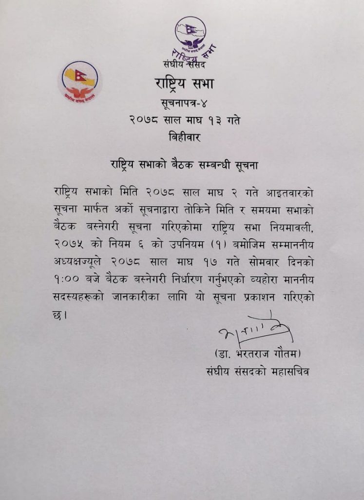राष्ट्रिय सभाको बैठक सम्बन्धी सूचना राष्ट्रिय सभाको मिति २०७८ साल माघ २ गते आइतवारको सूचना मार्फत अर्को सूचनाद्वारा तोकिने मिति र समयमा सभाको बैठक बस्नेगरी सूचना गरिएकोमा राष्ट्रिय सभा नियमावली, २०७५ को नियम ६ को उपनियम (१) बमोजिम सम्माननीय अध्यक्षज्यूले २०७८ साल माघ १७ गते सोमवार दिनको १ः०० बजे बैठक बस्नेगरी निर्धारण गर्नुभएको व्यहोरा माननीय सदस्यहरूको जानकारीका लागि यो सूचना प्रकाशन गरिएको छ।