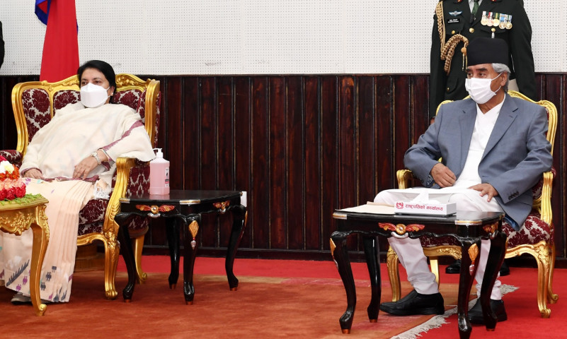 काठमाडौं। राष्ट्रपति विद्यादेवी भण्डारी र प्रधानमन्त्री शेरबहादुर देउवाबीच भेटवार्ता भएको छ । राष्ट्रपति शीतल निवासमा बिहीबार अपरान्ह ३ बजे राष्ट्रपति भण्डारी र प्रधानमन्त्री देउवाबीच नियमित भेटवार्ता भएको राष्ट्रपतिका प्रमुख स्वकीय सचिव भेषराज अधिकारीले जानकारी दिए ।
