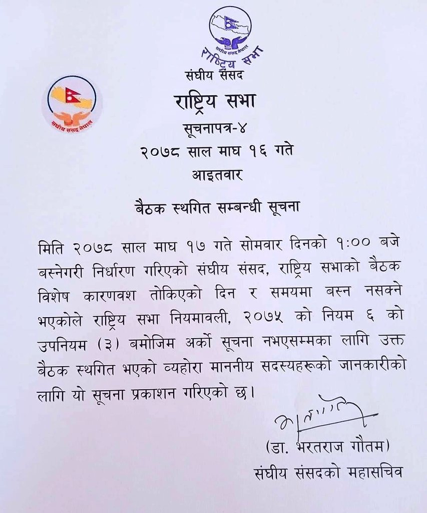 काठमाण्डौं । राष्ट्रियसभा वैठक अनिश्चितकालको लागि स्थगीत भएको छ । वैठक सोमवार १ बजे बस्ने भनिएपनि अनिश्चितकालको लागि वैठक स्थगीत गरिएको छ । संघिय ससद सचिवालयले जारी गरेको सुचना अनुसार,वैठक विशेष कारणवश स्थगीत गरिएको उल्लेख छ ।