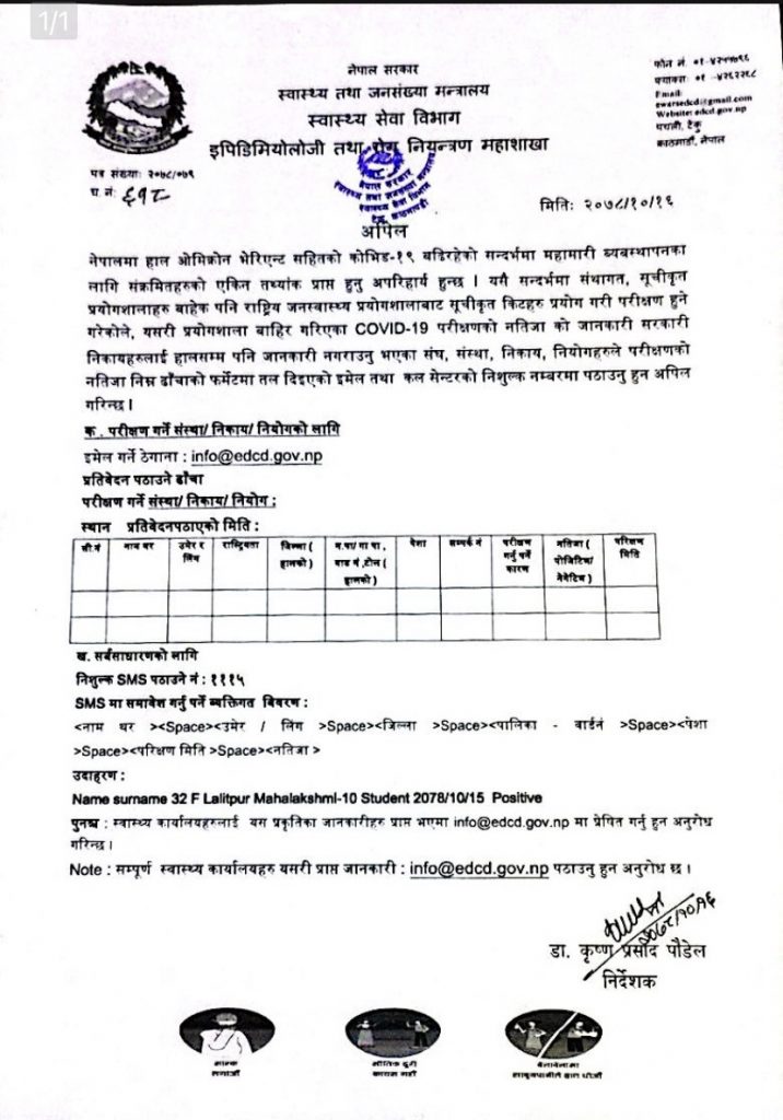इपिडिमियोलोजी तथा रोग नियन्त्रण महाशाखाले आज एक सूचना जारी गर्दै विभिन्न संघ संस्थाले आफैँ किट प्रयोग गरी गरेका परीक्षणको नतिजाबारे सरकारलाई जानकारी गराउन आग्रह गरेको हो ।