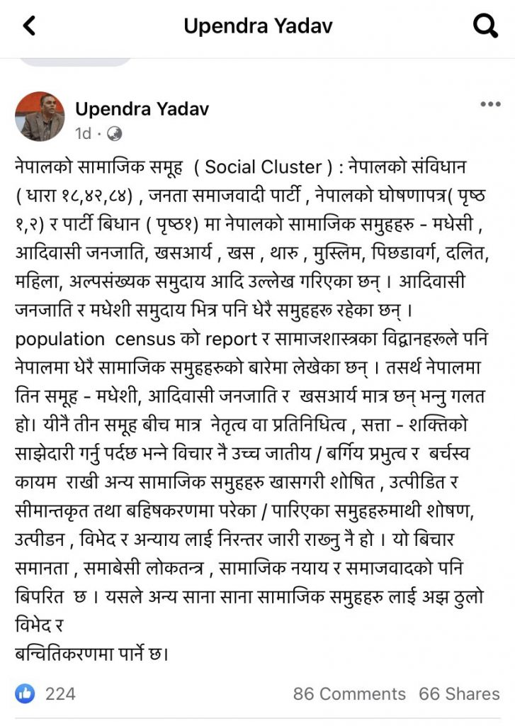 । जसपाभित्र यादव र डा.वावुराम भट्टराईको बीचमा अहिले रस्साकस्सी चलिरहेको कुरा सार्वजनिक विमर्शको विषय बनिरहेको बेलामा उनले सत्तामा सधैं खस,आर्य,आदिवासी जनजाति र मधेशी मात्र सहभागी हुन समावेशीताको सिद्धान्त विपरित भनेर लेखेका छन ।