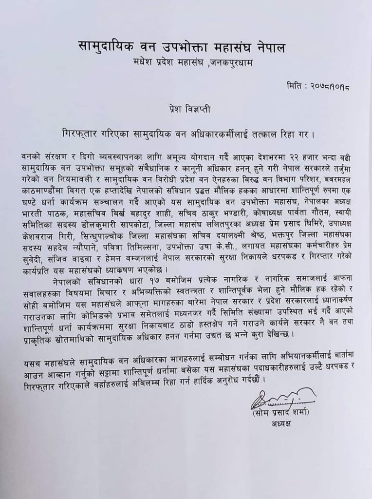 विज्ञप्तिमा वनको संरक्षण र दिगो व्यवस्थापनका लागि अमूल्य योगदान गर्दै आएका देशभरमा २२ हजार भन्दा बढी सामुदायिक वन उपभोक्ता समूहको संबैधानिक र कानूनी अधिकार हनन् हुने गरी नेपाल सरकारले तर्जुमा गरेको वन नियमावली र सामुदायिक वन विरोधी प्रदेश वन ऐनहरूका विरुद्ध वन विभाग परिशर, बबरमहल काठमाडौंमा विगत एक हप्तादेखि नेपालको संविधानप्रदत्त मौलिक हकका आधारमा शान्तिपूर्ण रुपमा एक घण्टे धर्ना कार्यक्रम सञ्चालन गर्दै आएको यस सामदायिक वन उपभोक्ता महासंघ, नेपालका अध्यक्ष भारती पाठक, महासचिव बिर्ख बहादुर शाही, सचिव ठाकुर भण्डारी, कोषाध्यक्ष पार्वता गौतम, स्थायी समितिका सदस्य डोलकमारी सापकोटा, जिल्ला महासंघ ललितपुरका अध्यक्ष प्रेम प्रसाद घिामर, केशवराज गिरी, सिन्धुपाल्चोक जिल्ला महासंघका सचिव दयालक्ष्मी श्रेष्ठ, भक्तपुर जिल्ला महासंघका सदस्य सहदेव न्यौपाने, पवित्रा तिमिल्सना, उपभोक्ता उषा के.सी., लगायत महासंघका कर्मचारीहरू प्रेम सवेदी, संजिव वाइवा र हेमन वम्जनलाई नेपाल सरकारको सुरक्षा निकायले धरपकड र गिरप्तार गरेको कार्यप्रति यस महासंघको ध्याकषण भएको छ ।
