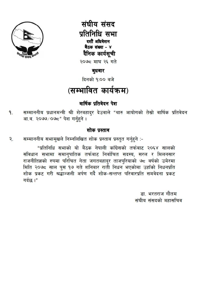 यस्तै, सभामुख अग्नी सापकोटाले सभासद जगतबहादुर ताजपुरियाको निधनमा शोक प्रस्ताव प्रस्तुत पेश गर्ने छन् ।