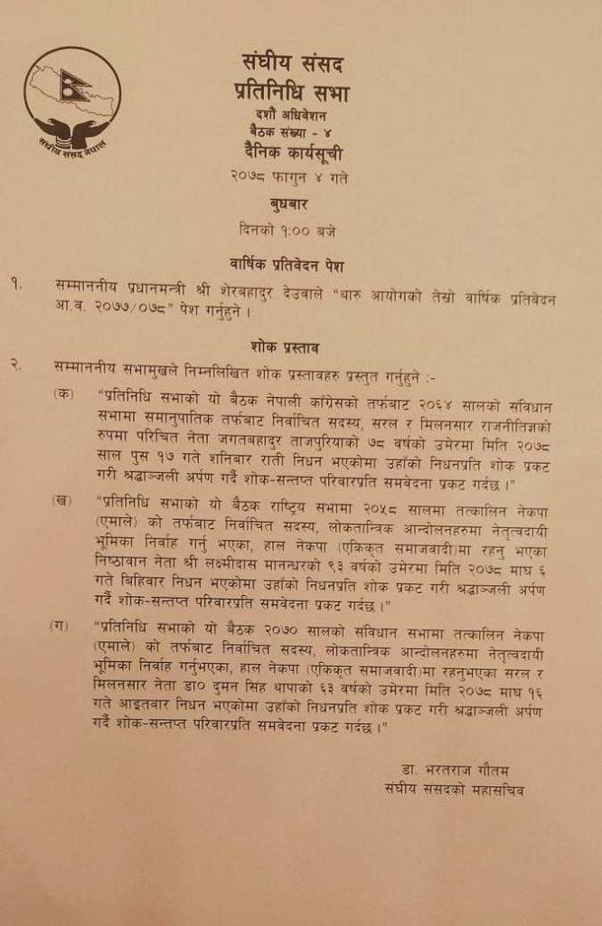 काठमाडौं । प्रतिनिधिसभाको कार्यसूचीमा एमसीसी सम्झौता अनुमोदन प्रस्तावलाई समावेश गरिएको छैन । उक्त प्रस्ताव बुधबार बस्ने प्रतिनिधिसभाको बैठकमा पेस गरिने तयारी थियो ।