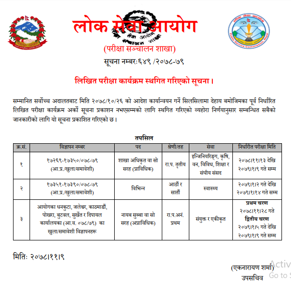 आयोगका अनुसार परीक्षा फागुन १३,वैशाख ९ मा शाखा अधिकृत वा सो सरह प्राविधिककाे परीक्षा तालिका थियो।