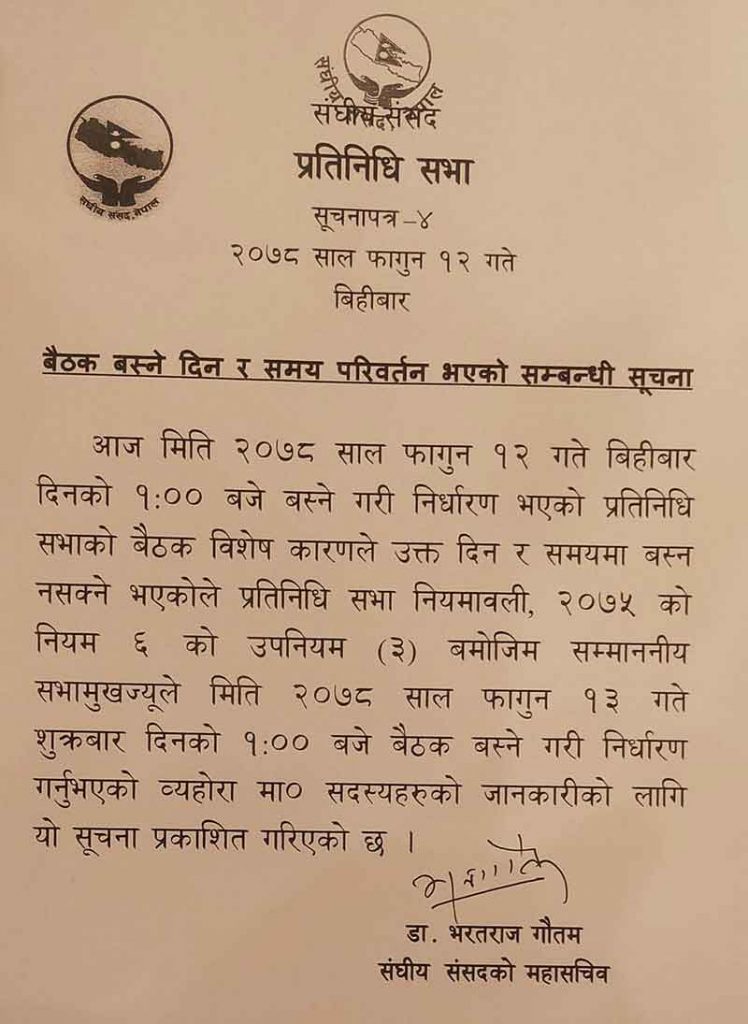 अर्को बैठक शुक्रबार १ बजे बस्ने भएको छ । संसद सचिवालयले सूचना टाँसेर बैठक भोलिसम्मका लागि स्थगित भएको जानकारी दिएको छ ।