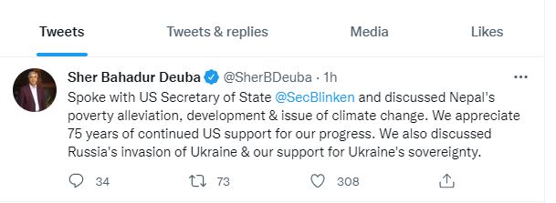 प्रधानमन्त्री देउवाले मंगलबार राति अमेरिकी विदेशमन्त्री एन्टोनी ब्लिनकेनसँग टेलिफोन कुराकानीमा रुस–युक्रेन युद्धका विषयमा छलफल भएको ट्वीटर मार्फत जानकारी दिएका हुन् ।