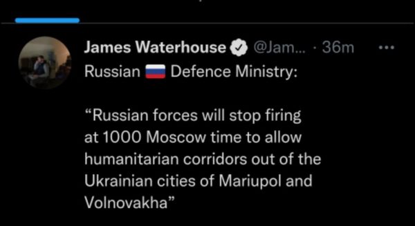 रुसको रक्षा मन्त्रालयले युक्रेनी सहर मारिओपो र भोल्नोभाखाबाट शनिवार मस्को समय अनुसार १० बजेबाट मानवीय सहयोग मार्ग खुल्ने जनाएको छ।