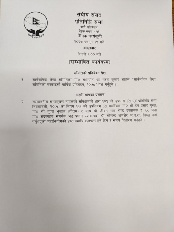 फागुन २९ गते आइतबारका लागि बोलाइएको प्रतिनिधिसभाको बैठकमा सभामुख अग्निप्रसाद सापकोटाले महाअभियोगमाथि छलफल हुने दिन र समय तोक्ने भएका छन् । आइतबारको बैठकको सम्भावित दैनिक कार्यसूचीमा पनि महाभियोग प्रस्तावमाथि छलफल हुने दिन र समय निर्धारण गर्ने उल्लेख छ ।