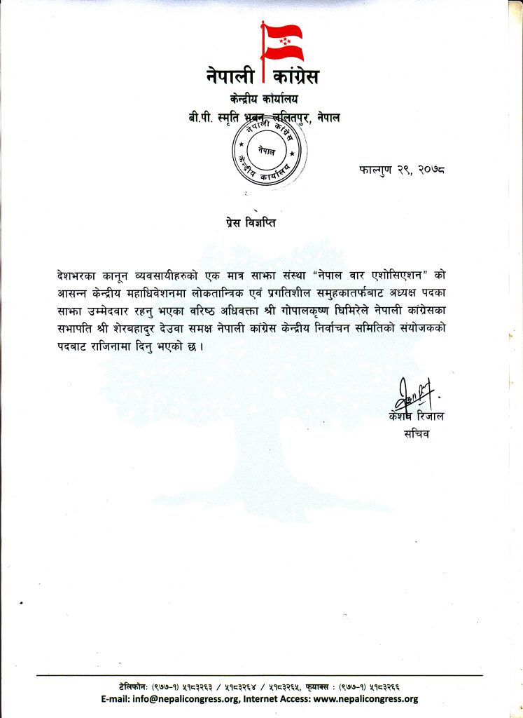 काठमाडौं । नेपाली कांग्रेसको केन्द्रीय निर्वाचन समितिका संयोजक वरिष्ठ अधिवक्ता गोपालकृष्ण घिमिरेले पदबाट राजीनामा दिएका छन् ।