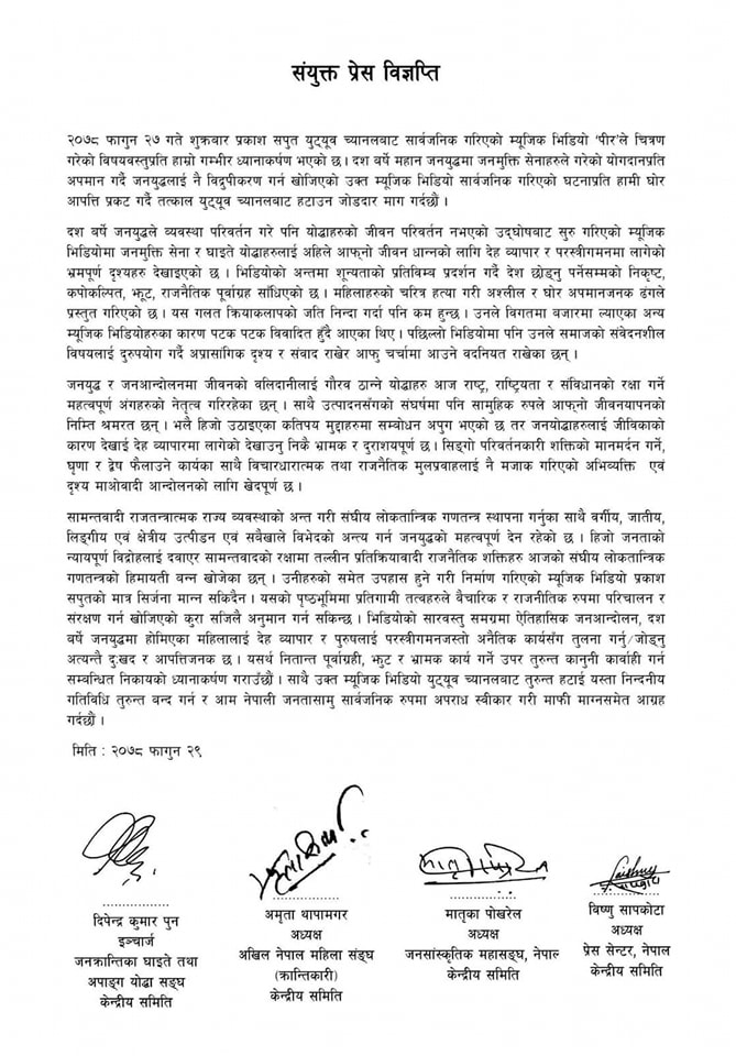 तत्काल युट्यसवबाट म्युजिक भिडियो हटाउन माग गर्दै विज्ञप्तिमा भनिएको छ, ‘उक्त म्यूजिक भिडियो युट्यूब च्यानलबाट तुरुन्त हटाई यस्ता निन्दनीय गतिविधि तुरुन्त बन्द गर्न र आम नेपाली जनतासामु सार्वजनिक रुपमा अपराध स्वीकार गरी माफी माग्नसमेत आग्रह गर्दछौं ।’