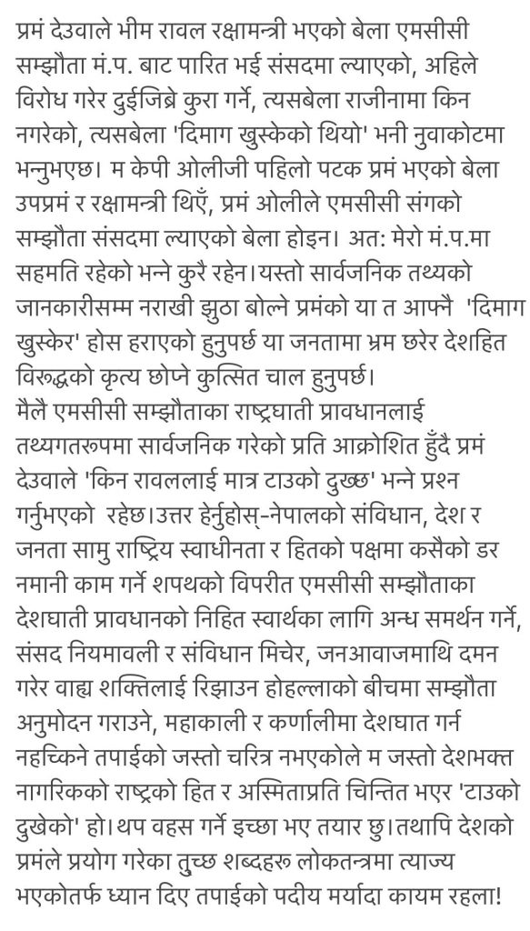 काठमाण्डौं । प्रधानमन्त्री शेरवहादुर देउवाले एमाले नेता भीम रावललाइ एमसीसीको वारेमा झुठा कुरा गरेको भनेपछि नेता रावलले पनि जवाफ फर्काएका छन । उनले सामाजिक सञ्जाल मार्फत प्रधानमन्त्री देउवाले झुठा र उदण्डतापूर्ण कुरा गरेको आरोप लगाएका छन । नेता रावलले आफु मन्त्री हुदा एमसिसी नआएको भन्दै देउवाले यसअघि नै ल्याएको भन्दै लामो प्रमाण पेश गरेका छन ।