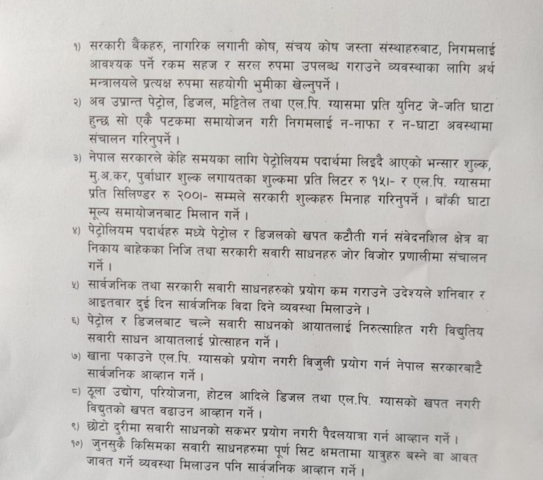 इन्धनको मूल्य वृद्धिबाट उपभोक्तालाई बचाउन र निगमलाई जोगाउन भन्दै १० बुँदे प्रस्ताव मन्त्रालयमा पठाइएको हो । इन्धनको करसँगै एलपी ग्यासमा प्रतिसिलिन्डर २ सय रुपैयाँ शुल्क मिनाहा गर्नुपर्ने र बाँकी घाटा मूल्य समायोजनबाट मिलान गर्नुपर्ने निगमले जनाएको छ ।