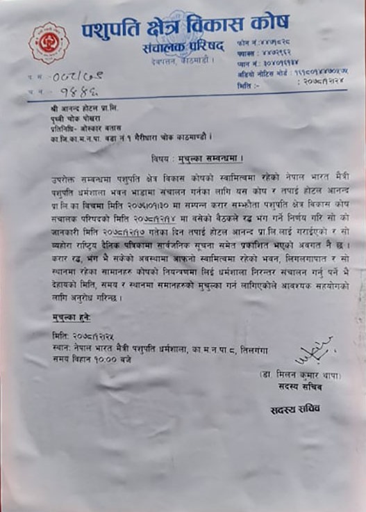 त्यसपछि गत सोमबार पशुपति क्षेत्र विकास कोषले होटल आनन्द सञ्चालन गरिएको पशुपति धर्मशाला भवन खाली गर्न सार्वजनिक सूचना निकालेको थियो । सूचनामा धर्मशालामा रहेका सरसामान हटाउन भनिएको थियो । त्यसैले कोषले धर्मशाला खाली गराउन प्रयत्न गरे पनि बतास समूहले मानेको छैन ।