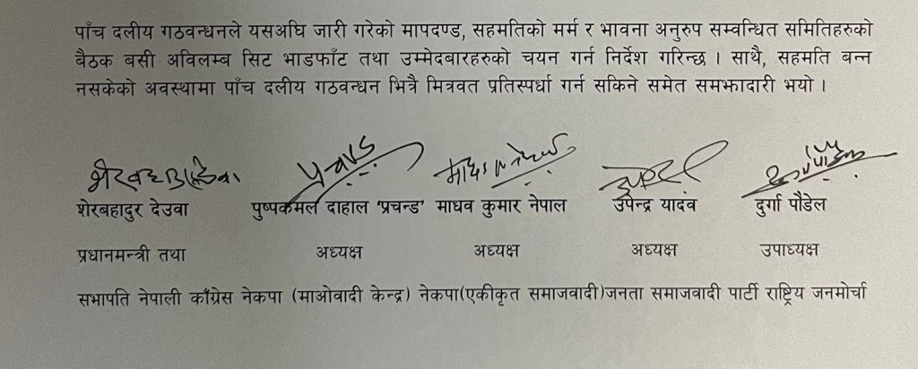 ‘पाँच दलीय गठबन्धनले यसअघि जारी गरेको मापदण्ड, सहमतिको मर्म र भावना अनुरुप सम्बन्धित समितिहरुको बैठक बसी अविलम्व सिट बाँडफाँट तथा उम्मेदवारहरुको चयन गर्न निर्देश गरिन्छ । साथै, सहमति बन्न नसकेको अवस्थामा पाँच दलीय गठबन्ध भित्रै मित्रवत प्रतिस्पर्धा गर्न सकिने समेत समझदारी भयो,’ पाँच दलले आज जारी गरेको विज्ञप्तिमा भनिएको छ ।