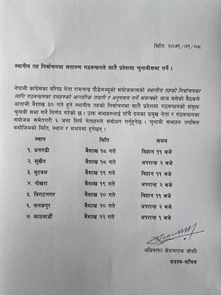 यस्तै, २० वैशाख बिहान ११ बजे प्रदेश १ को विराटनगर र सोही दिन दिउँसो २ बजे मधेस प्रदेशको राजधानी जनकपुरमा चुनावी सभा छ । एक दिन खाली राखेर गठबन्धनले २२ वैशाखमा संघीय राजधानी काठमाडौंमा शक्ति प्रदर्शनसहित चुनावी सभा गर्ने भएका छन् ।