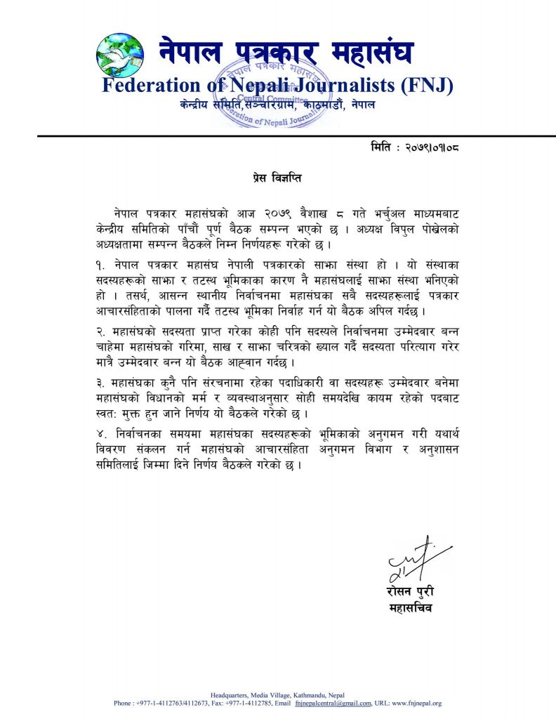 महासंघका महासचिव रोशन पुरीले बिहीबार विज्ञप्ति जारी गरेर महासंघको सदस्यता प्राप्त गरेका कोही पनि सदस्यले निर्वाचनमा उम्मेदवार बन्न चाहेमा महासंघको गरिमा, साख र साझा चरित्रको ख्याल गर्दै सदस्यता परित्याग गरेर मात्रै उम्मेदवार बन्न आग्रह गरेका हुन् ।