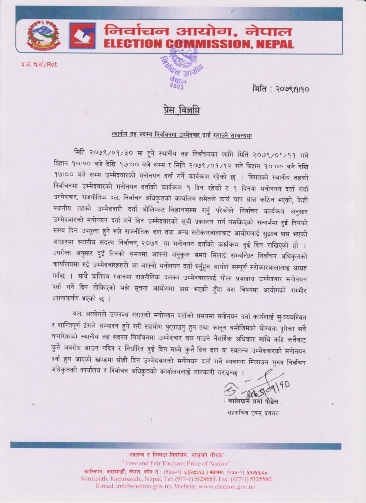 काठमाडौं । निर्वाचन आयोगले दुई दिनको समयभित्र आफ्नो अनुकूल समय व्यावस्थापन गरेर निर्वाचन अधिकृतको कार्यालयमा स्वयम उपस्थित भइ उम्मेदवारहरूले आ आफ्नो मनोनयन दर्ता आग्रह गरेको छ । स्थानीय तह सदस्य निर्वाचनका लागि वैशाख ११ गते र १२ गते बिहान १० बजे देखि साँझ ५ बजे सम्म उम्मेदवाहरुले आफ्नो मनोनयन दर्ता गर्ने कार्यतालिका रहेको छ ।