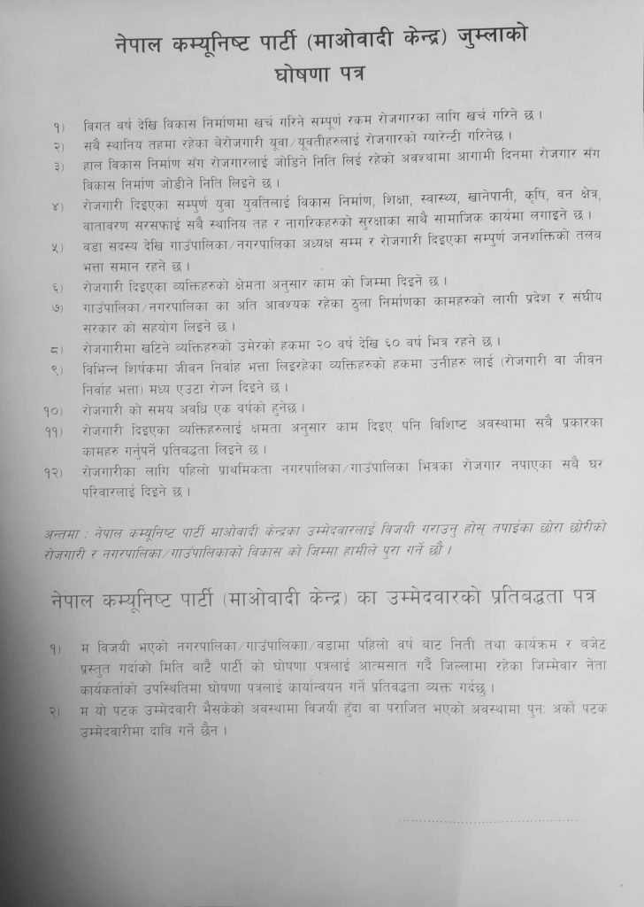 माओवादी केन्द्रका उम्मेदवारको प्रतिबद्धता पत्र