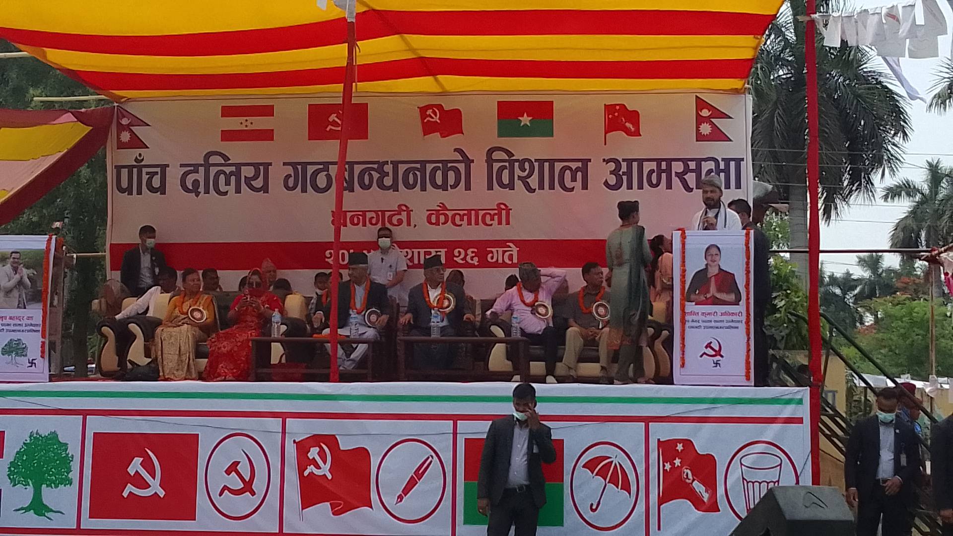 धनगढीमा सोमबार आयोजित पाँच दलीय गठबन्धनले आयोजना गरेको आमसभालाई सम्बोधन गर्दै प्रचण्डले गणतन्त्र उल्ट्याउन खोज्ने एमाले र संविधान जोगाउने गठबन्धनबीच प्रतिस्पर्धा भइरहेको बताएका हुन् ।