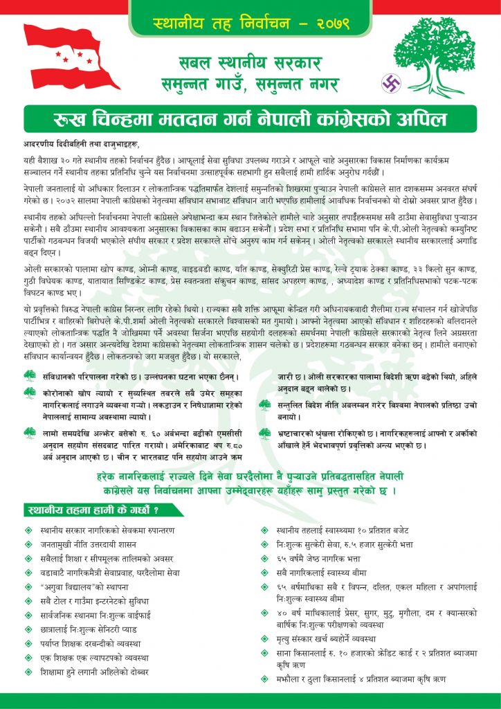 नेपाली जनतालाई यो अधिकार दिलाउन र लोकतान्त्रिक पद्धतिमार्फत देशलाई समुन्नतिको शिखरमा पु¥याउन नेपाली कांग्रेसले सात दशकसम्म अनवरत संघर्ष गरेको छ । २०७२ सालमा नेपाली कांग्रेसको नेतृत्वमा संविधान सभाबाट संविधान जारी भएपछि हामीलाई आवधिक निर्वाचनको यो दोस्रो अवसर प्राप्त हुँदैछ ।