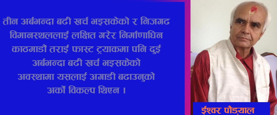 विमानस्थलमा अहिलेसम्म तीन अर्बभन्दा बढी खर्च भइसकेको र विमानस्थललाई नै लक्षित गरेर बनाउन लागेको काठमाडौं तराई द्रुतमार्गमा पनि दुई अर्बभन्दा बढी खर्च भइसकेको अवस्थामा यसलाई अगाडि बढाउनुको अर्को विकल्प थिएन ।