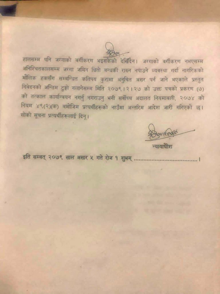 जग्गाको वर्गीकरण नभएसम्म अनिश्चितकालसम्म जग्गा जमिन धितो बन्धकी राख्न नपाउने व्यवस्था गर्दा नागरिकको मौलिक हकसँग सम्बन्धित कतिपय कुरामा अनुचित असर पर्न जाने भएकाले प्रस्तुत निवेदनको अन्तिम टुङ्गो नलागेसम्म मिति २०७९।२।२७ को उक्त पत्रको प्रकरण (७) को तत्काल कार्यान्वयन नगर्नु नगराउन अन्तरिम आदेश जारी गरिएको छ ।