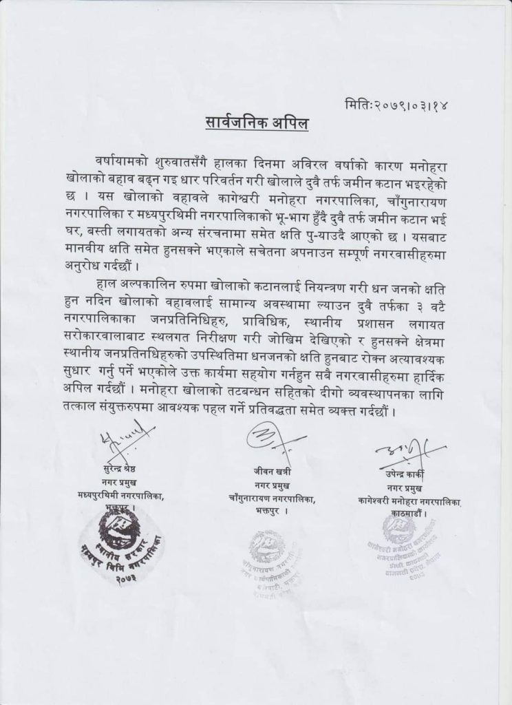 चाँगुनारायण नगरपालिकाका नगर प्रमुख जीवन खत्री,कागेश्वरी मनोहरा नगरपालिकाका नगर प्रमुख उपेन्द्र कार्की र मध्यपुर थिमि नगरपालिकाका नगर प्रमुख सुरेन्द्र श्रेष्ठले संयुक्त रुपमा मनोहरा कटान क्षेत्रको मंगलबार स्थलगत निरिक्षण गरेका हुन । चाँगुनारायणका मेयर जीवन खत्रीको संयोजनमा तीन वटै नगरपालिकाका प्रमुखहरु एकसाथ स्थलगत निरिक्षण र छलफलमा जुटेका हुन ।