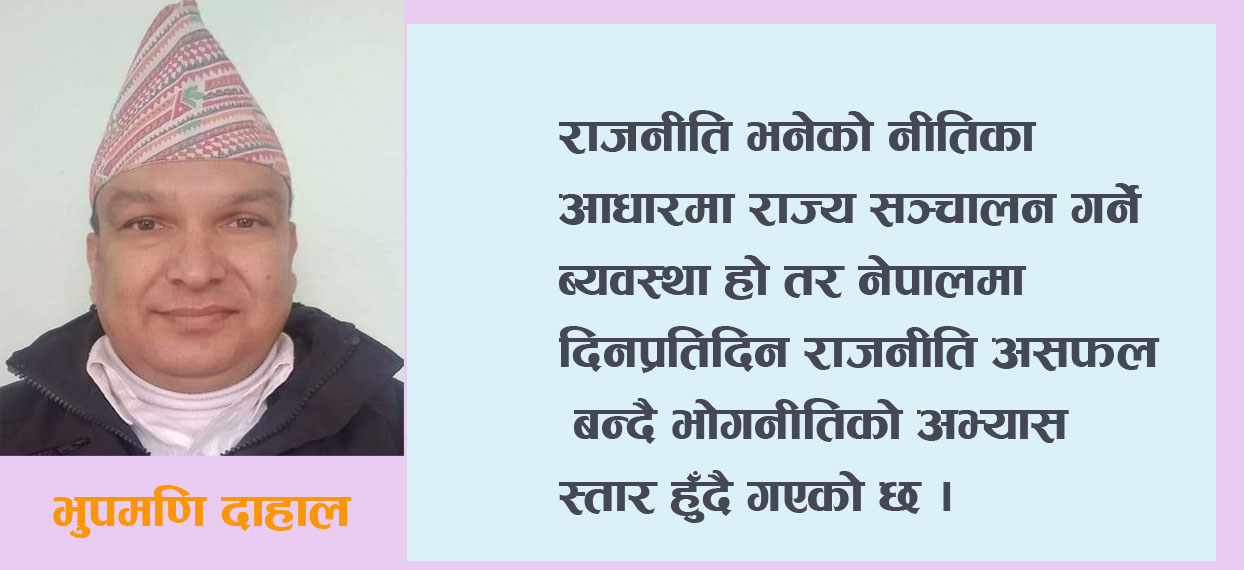 देशमा नीति बनेका छन् नेतृत्व अदूरदर्शी छ । कानुन बनेको छ कार्यान्वयन हुदैन । राजनीति भनेको नीतिका आधारमा राज्य सञ्चालन गर्ने ब्यवस्था हो तर नेपालमा दिनप्रतिदिन राजनीति असफल बन्दै भोगनीतिको अभ्यास विस्तार हुँदै गएको छ । भोगनीतिमा राज्यका श्रोत साधनहरुका दोहन गरी भोग गर्नका लागि नीति बनाइएको हुन्छ र त्यही नीतिको कार्यान्वयन गरी डाडुपन्यु हातमा लिने समुहले तिनै श्रोत हरुको अनाधिकृत रुपले भाइको नाममा, बहिनी ज्वाइँका लाममा, साला, साली, सासू ससुरा साला जेठान आदिका नाममा भोग गरिरहेकोका हुन्छन । जनता दैनिक प्रश्न उठाइरहेका छन उनीहरुलाई मौखिक विकासको नशामा लठ्ठ बनाइएको छ । दलहरु भित्र तहगत गुटहरु ब्यवस्थित रुपले झँंगिदै गएका छन । आफ्नै राजनीतिक दलभित्र गुट नमिल्नेहरु पराई बन्दै गएका छन । राजनीतिका नामामा आफ्नो सर्वश्वहरुण भएर कष्टपूर्ण जीवन विताउन बाध्य परिवारहरु आज चालीसौँ वर्षपछि पनि काठमाण्डांैमा एउटा छाप्रो हाल्न नसकेर कोठामै जीवन धान्न बाध्य छन तर पछिल्लो समयमा राजनीतिभित्र चुलिएको ठेकेदारीको बिस्तारसँगै राजनीतिमा लागेको दशकभित्रै घरघडेरी, गाडी घोडा सहित सुविधासम्पन्न बंगालाको मालिक बनेका छन । चुनावमा टिकट किन्न तिनै सक्षम हुन्छन, नेताहरुलाई विदेश शयर गराउन तिनै तत्पर रहन्छन, चुनावलाई अनधिकृत उपयोग गर्दै मत खरिद गर्न उनीहरु नै सक्षम रहने अवस्था मौलाउँदै गएकोले निष्ठा, त्याग, सिद्धान्त, प्रणली, विधि, पद्धति धारासायी बन्दै गएको कारण स्वतन्त्र, अभियन्ता र समाजसेवीको भेषमा टाउको उठाउनेहरु यत्र तत्र सर्बत्र देखिन थालेका छन ।