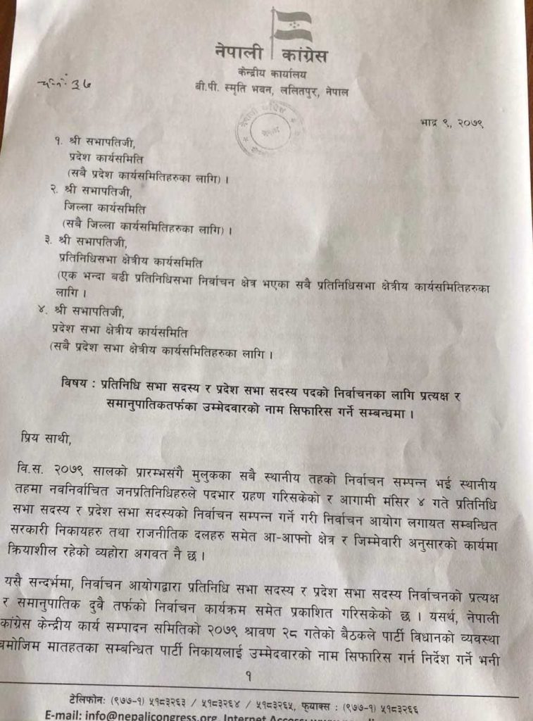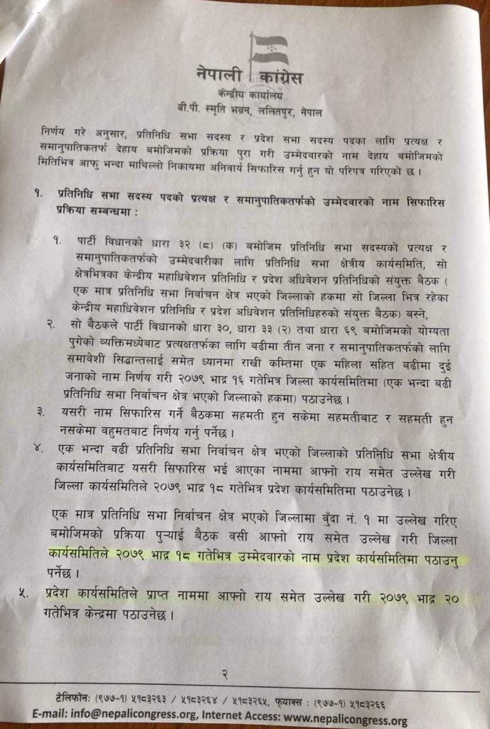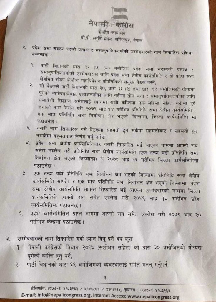यसै गरी प्रतिनिधि सभा उम्मेदवारका लागि योग्यता पुगेका व्यक्तिमध्येबाट प्रत्यक्षतर्फका लागि एक भन्दा बढी निर्वाचन क्षेत्र भएको जिल्लामा बढीमा तीन जना र समानुपातिकतर्फको लागि समावेशी सिद्धान्तलाई समेत ध्यानमा राखी कम्तिमा एक महिला सहित बढीमा दुई जनाको नाम निर्णय गरी १६ गतेभित्र जिल्ला कार्यसमितिमा पठाउनु पर्नेछ ।