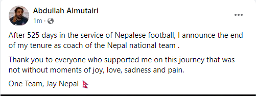 काठमाडौं । नेपाली राष्ट्रिय फुटबल टिमका प्रमुख प्रशिक्षक अब्दुल्लाहा अल्मुताइरीले राजीनामा दिएका छन् । अलमुताइरीले आइतबार समाजिक सञ्जालमार्फत आफ्नो नेपाली टिमसँगको पाँच सय २५ दिनको यात्रा टुङ्गिएको बताएका हुन् ।