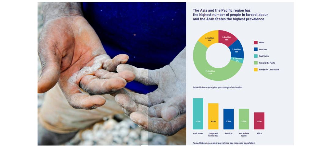 प्रतिवेदनमा सार्वजनिक भएको तथ्याङ्कअनुसार जबरजस्ती श्रममा लगाइएका घटनामध्ये ८६ प्रतिशत निजी क्षेत्रसँग सम्बन्धित छन्। अर्कोतर्फ, पैसाको लेनदेनमा संलग्न यौन शोषण बाहेक अन्य क्षेत्रमा जबरजस्ती श्रम गर्ने यस्ता घटनामध्ये करिब ६३ प्रतिशत रहेको छ। कुल जबरजस्ती श्रम गराइएको मामिलामा २३ प्रतिशतचाहिँ पैसाको लेनदेन समावेश गरी जबरजस्ती यौन शोषणको मामिला आउँछ। यस्ता घट्नामा प्रत्येक पाँचमध्ये चारजना महिला वा बालिका पीडित थिए।