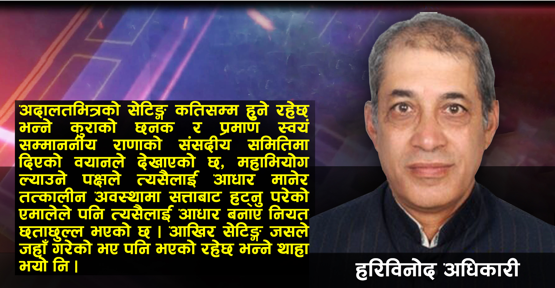 महाभियोग ल्याउने पक्षले पनि त्यसैलाई आधार मानेको र तत्कालीन अवस्थामा सत्ताबाट हट्नु परेको एमालेले पनि त्यसैलाई आधार बनाएर सेटिङ्को नियत छताछुल्ल भएको भनिरहेका छन् । आखिर सेटिङ् जसले जहाँ गरेको भए पनि भएको रहेछ भन्ने हामीले बुझेका हौं ।
