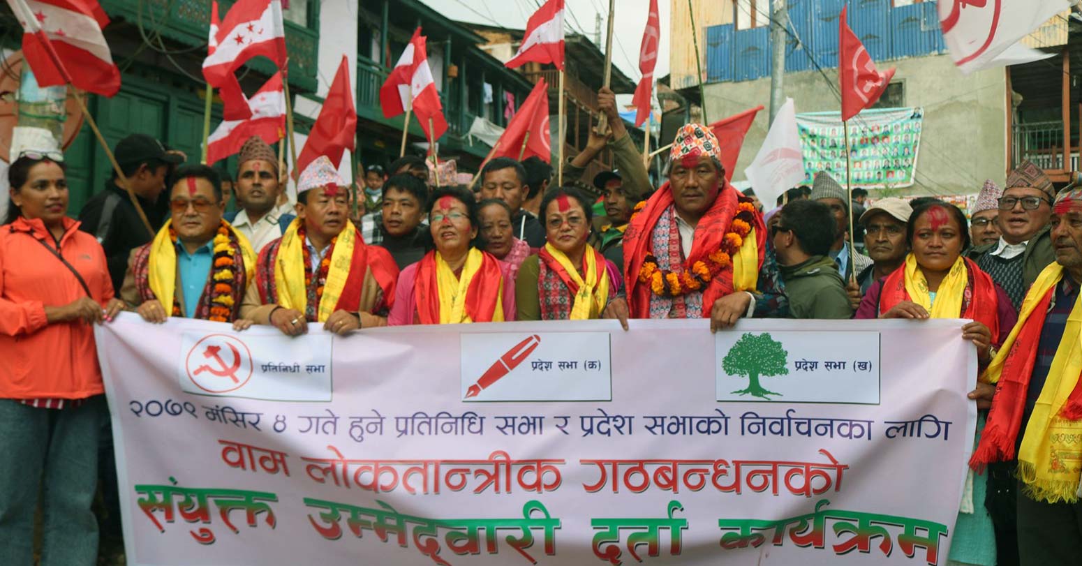 आगामी मङ्सिर ४ गते हुने प्रतिनिधिसभा तथा प्रदेशसभा निर्वाचनमा चुनावी तालमेल गरेका नेपाली कांग्रेस, नेकपा (माओवादी केन्द्र)र नेकपा (एकीकृत समाजवादी) का साझा उम्मेदवारले संयुक्तरुपमा हातेपर्चा प्रकाशन गरेर प्रतिवद्धता जनाएका हुन् ।