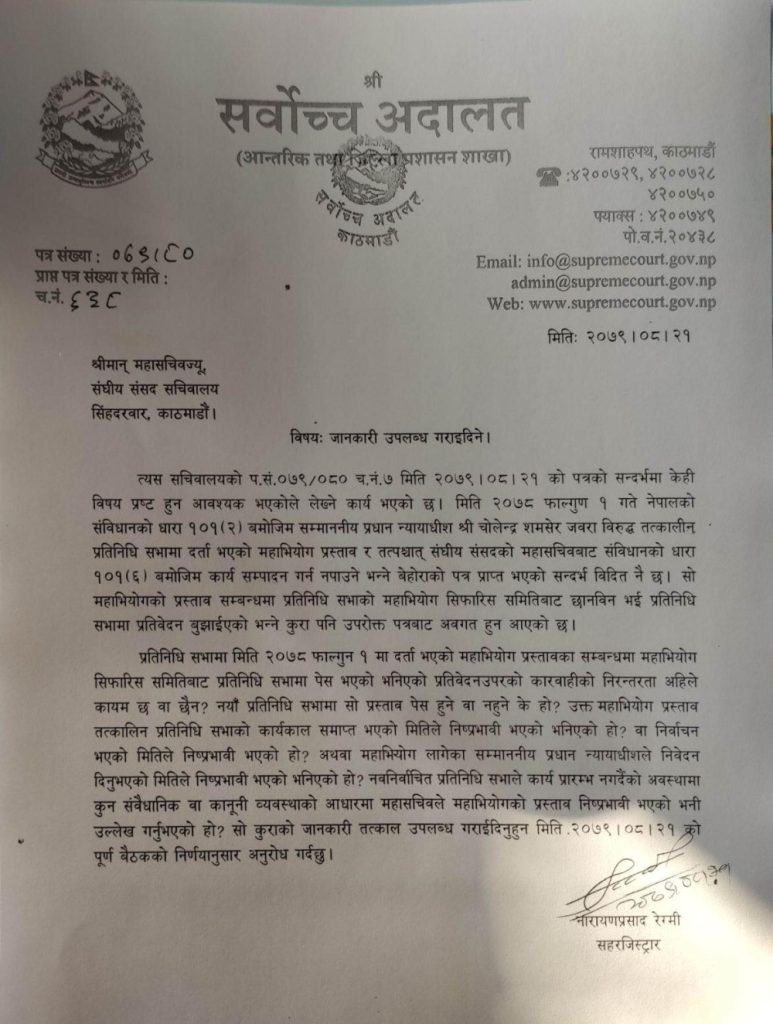 काठमाडौँ ।सर्वोच्च अदालतको पूर्ण इजलासले संसदलाई निलम्वित प्रधानन्यायाधीश चोलेन्द्र शमशेर जबरालाई कुन संवैधानिक र कानुनी व्यवस्था अनुसार महाभियोग निष्प्रभावी भएको पत्र दिइएको हो भनेर जानकारी माग गरेको छ ।